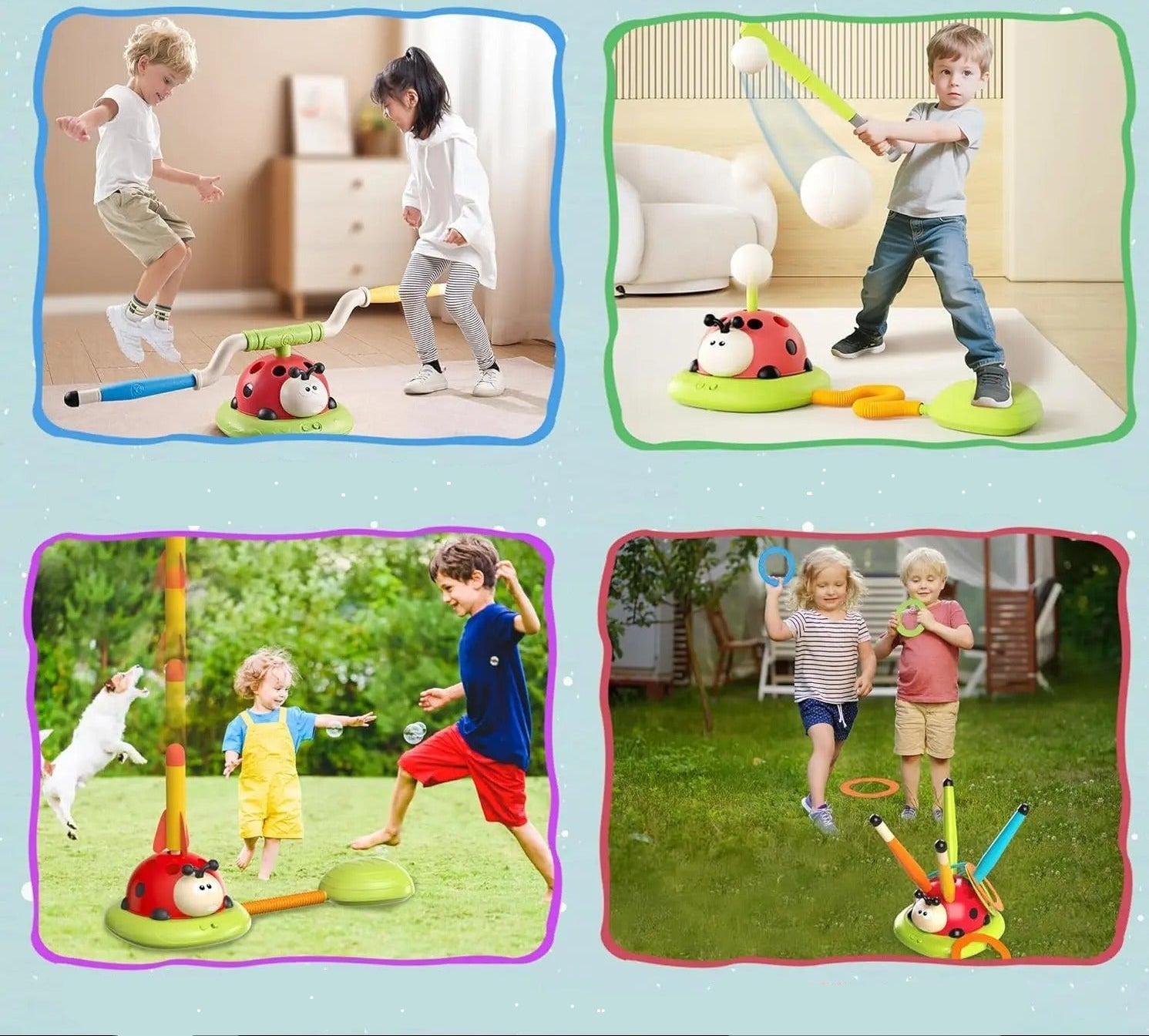 צעצוע ספורט אינטראקטיבי 4 ב־1 לילדים (מגיל 3 ומעלה): בייסבול – קפיצה מוזיקלית – זריקת טבעת – 3 רקטות פום